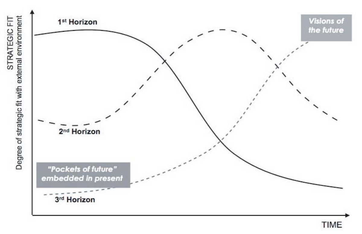 The Three Horizons model from Curry, Hodgeson and Sharpe, looks at how the strategic fit of a system changes over time. This change is represented by three horizons.