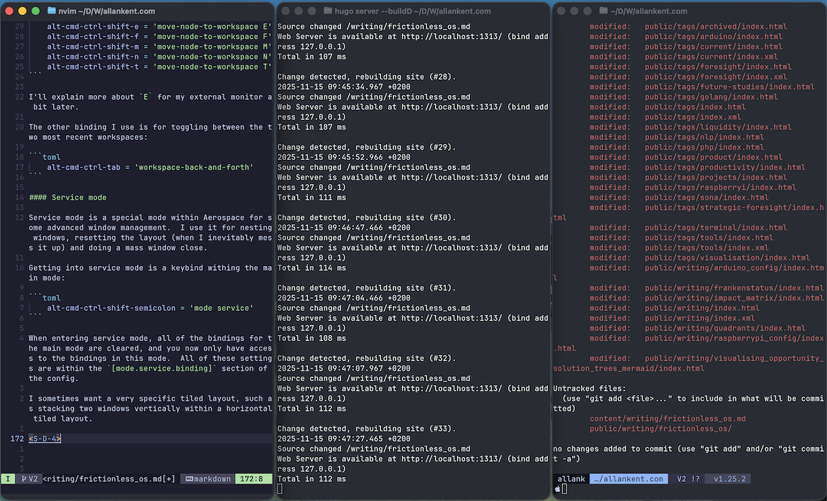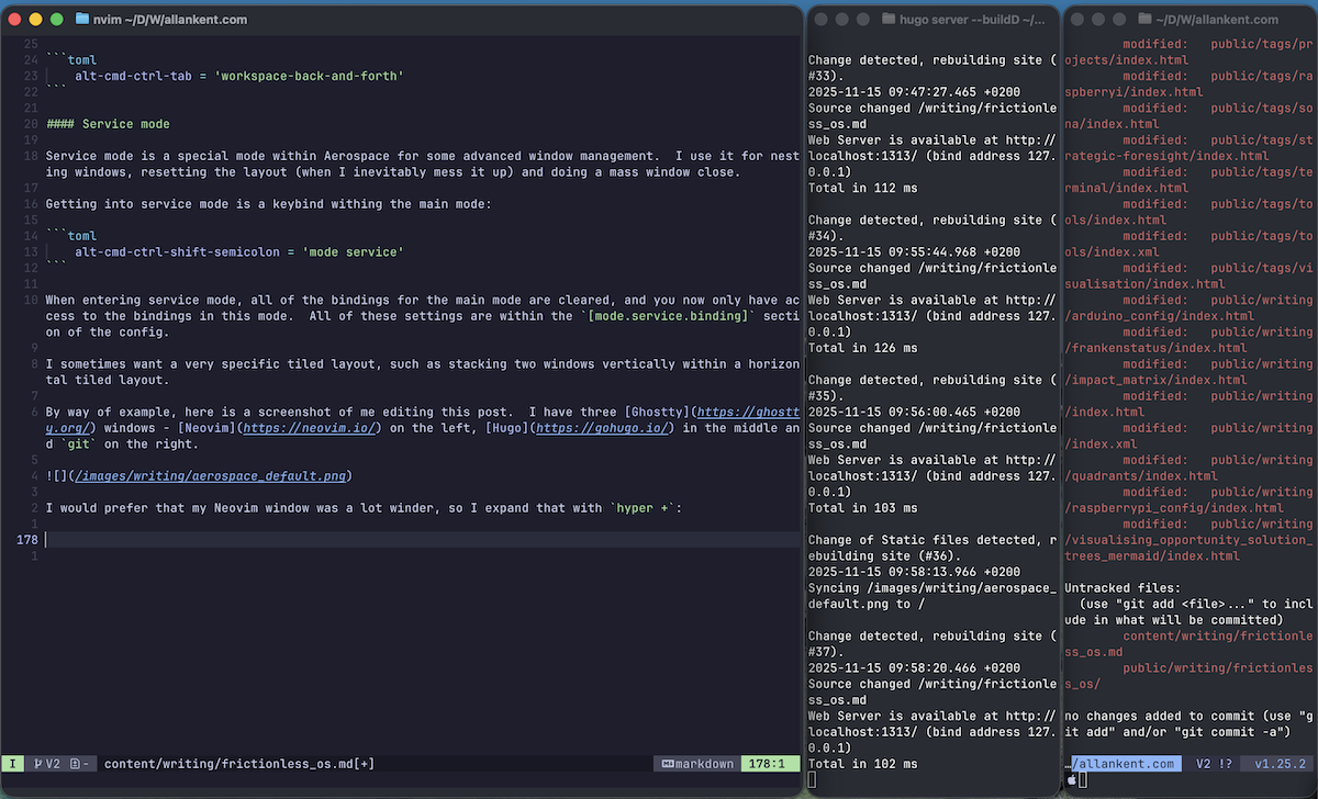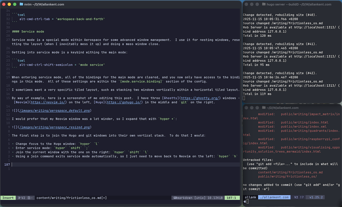 By way of example, here is a screenshot of me editing this post. I have three Ghostty windows - Neovim on the left, Hugo in the middle and git on the right.