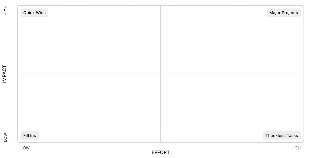Optimise your workload by weighing potential impact against the effort required. This matrix helps you identify quick wins (high impact, low effort), major projects (high impact, high effort), and avoid time sinks, guiding you to smarter resource allocation.