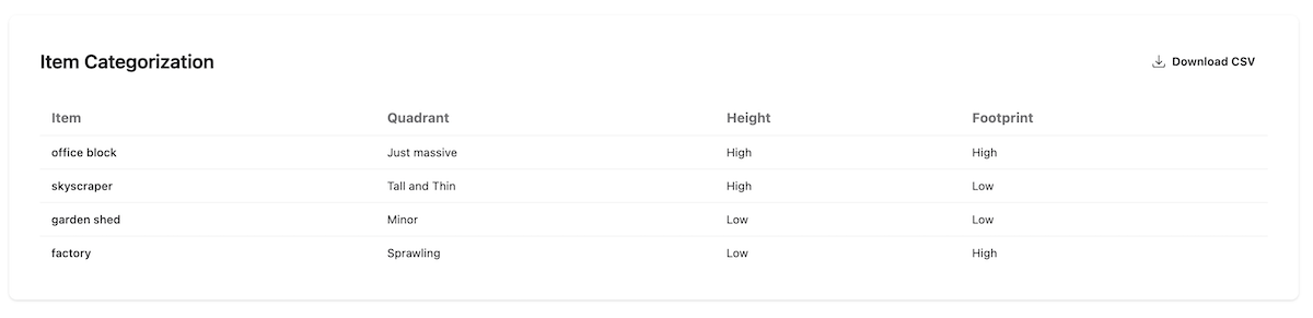 In the example below I’ve filled out the Custom settings for a contrived example categorising buildings. It goes without saying that I know very, very little about buildings.