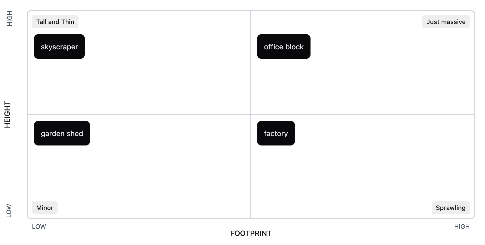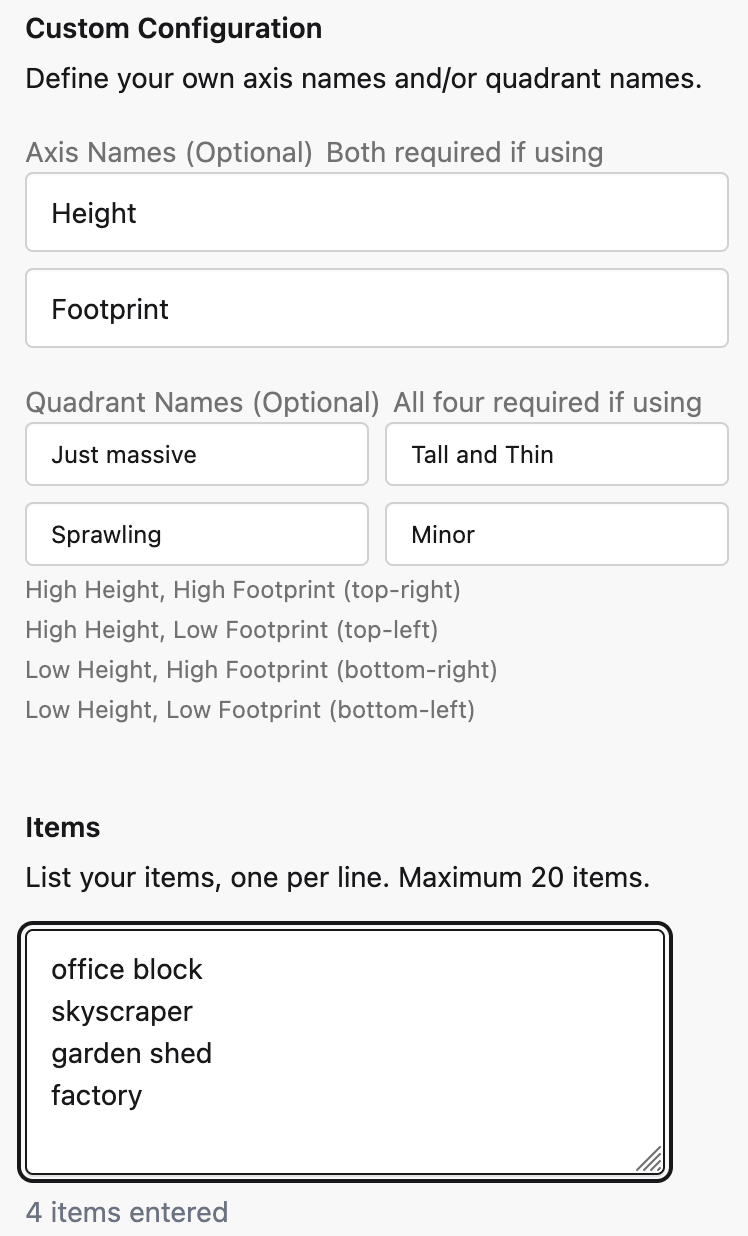 Choose one of the pre-defined types, or select Custom to define your own. When choosing Custom you then have to provide the names of your axes. The two options for each axis defaults to Low and High, so name your axes such that low and high make sense. You also have the option of giving you individual quadrants a descriptive name.